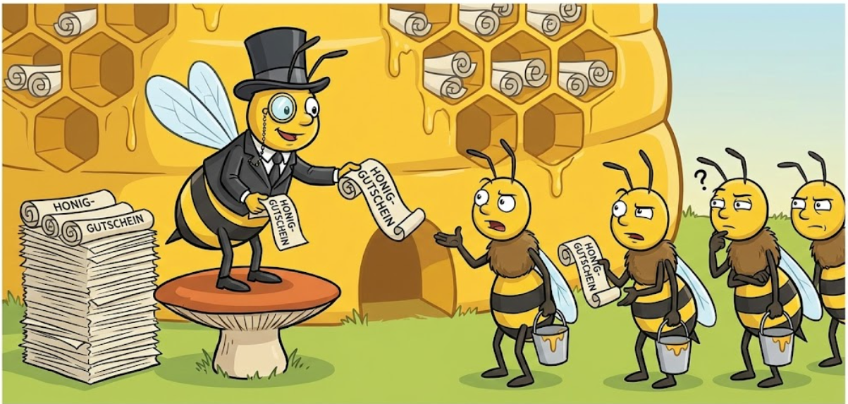 Imagine a "banker bee" in a beehive who decides: "Winter will be harsh. Instead of collecting real nectar, I'll simply distribute vouchers for honey."